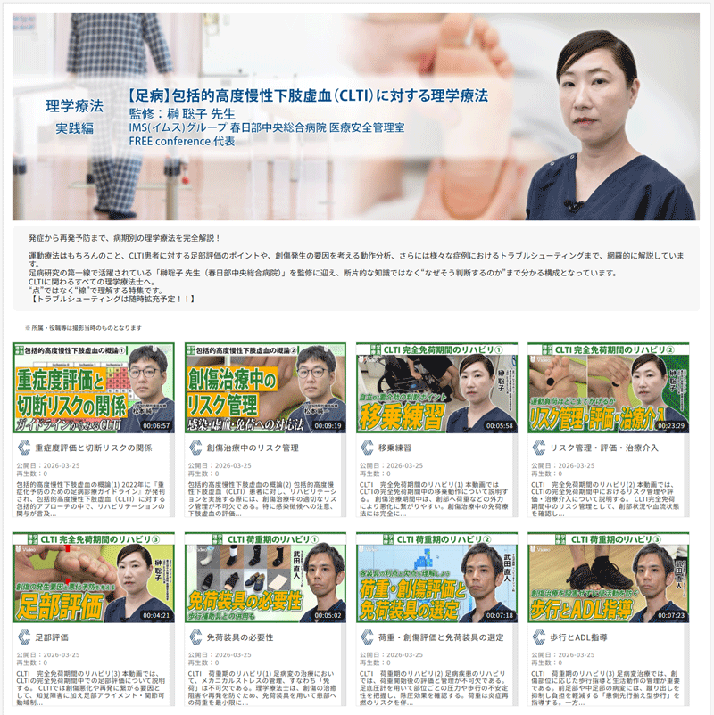 今回は、新規特集として「【足病】包括的高度慢性下肢虚血(CLTI)に対する理学療法」シリーズ(全40動画)を公開するとともに、先月公開した 日本臨牀コラボレーションシリーズにも新たな動画を追加いたしました。 ※各動画の視聴方法 本サービスは、メディカルオンラインのフリーアクセスプランをご利用中の大学・病院・専門学校に無料で公開いたします。また、パッケージプランをご購入いただいているお客様には、2027年3月末まで無料でご利用いただけます。